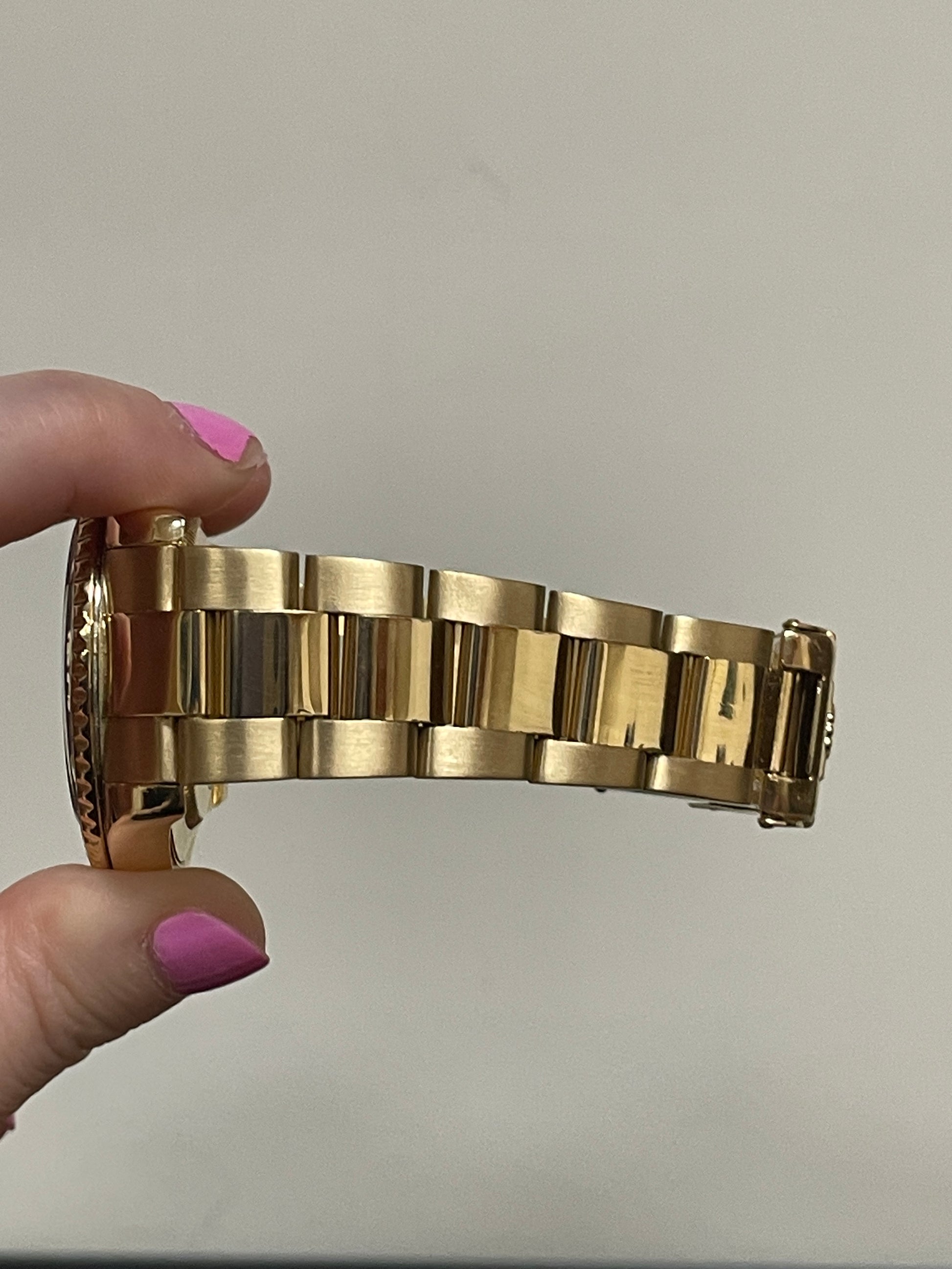 Condition: 9/10- Very light scratching on bracelet. Overall very nice! The bracelet has minor play to it but it will not affect how the watch wears on the wrist. No holes case solid 18kt gold with a weight of 173.8 grams