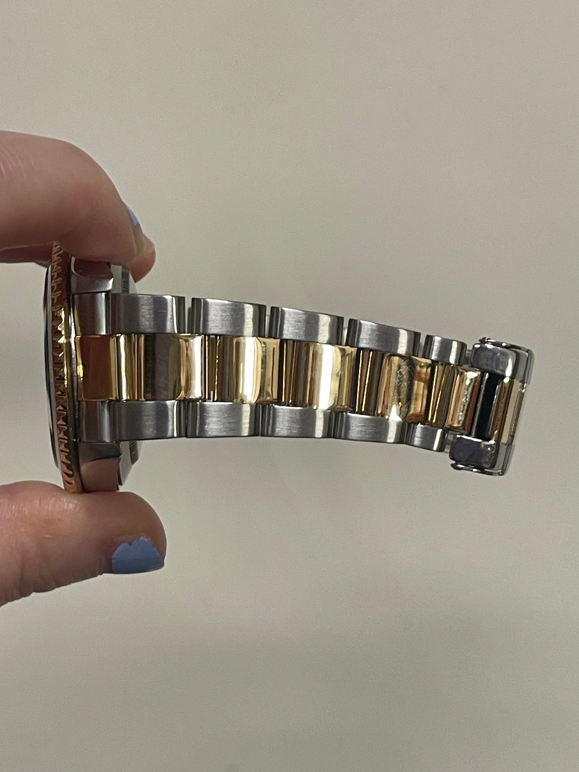 Condition: 9/10- Watch has been polished and is in excellent condition! Tiny scratch on top of bezel insert. This is a no holes case solid end link with the gold through clasp. Great timepiece overall! The crown emblem on the clasp is slightly over polished, but still visible and will look great on the wrist.