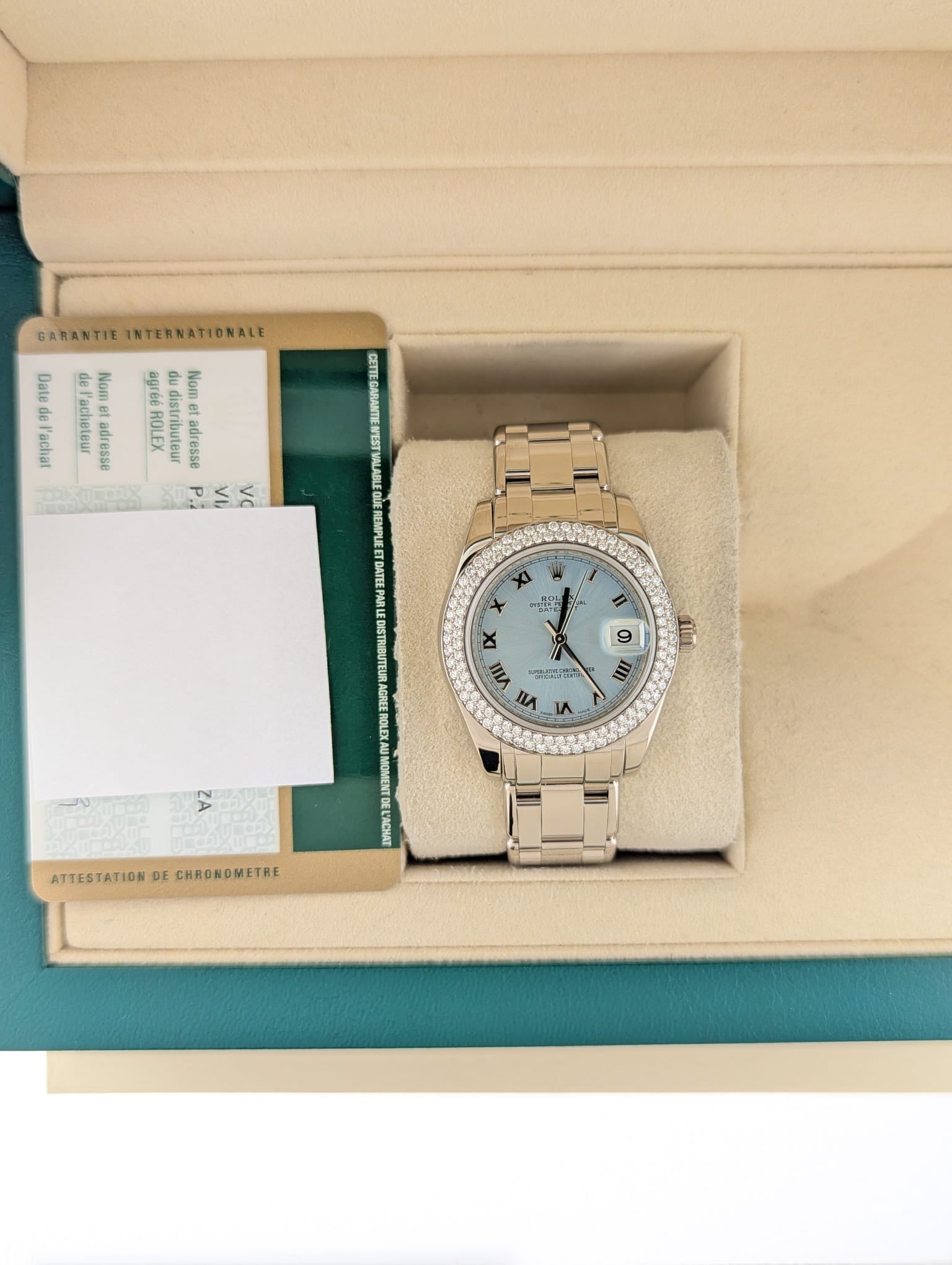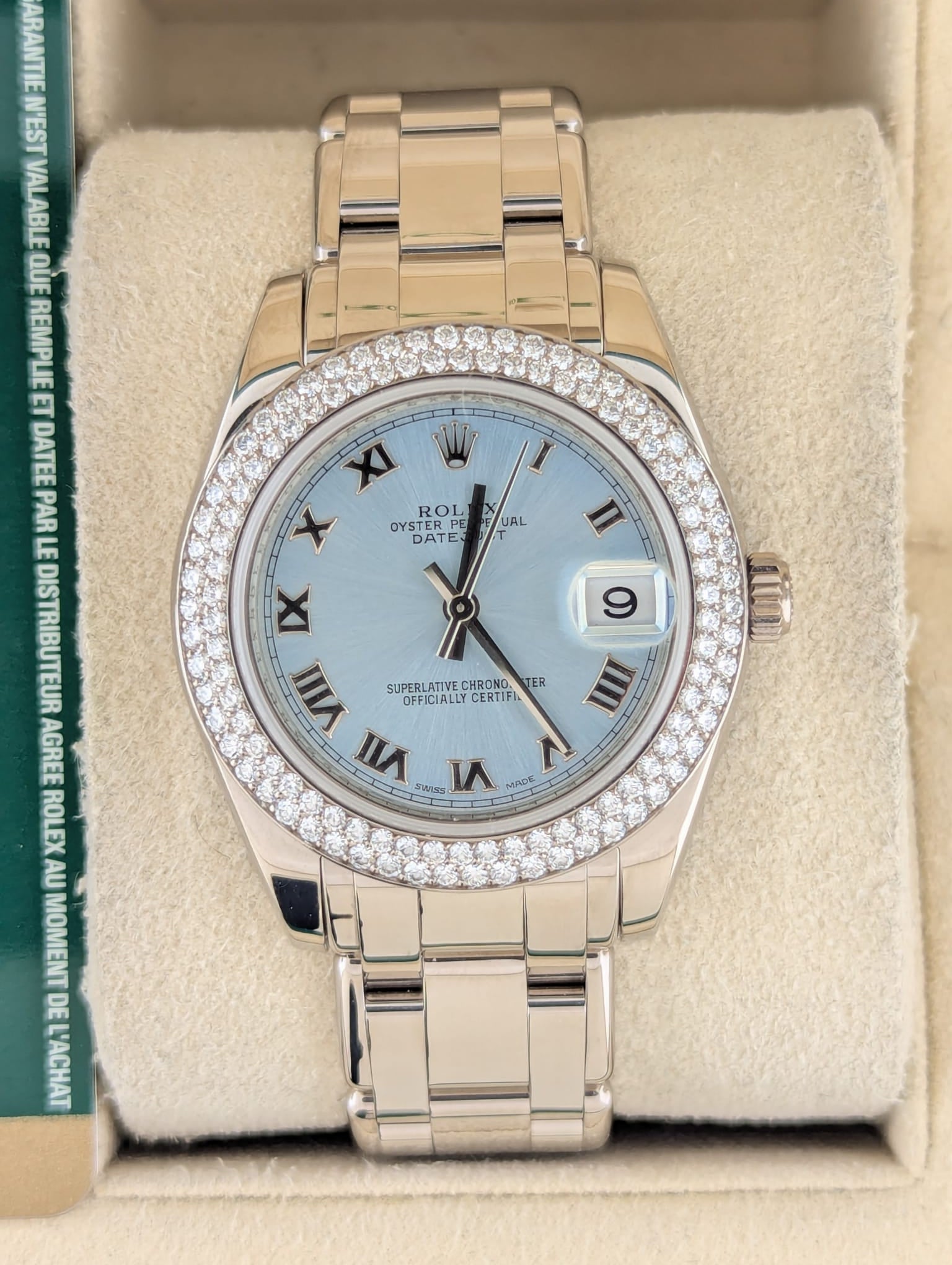 2009 Rolex Pearlmaster 81339 Blue Roman Two Row Diam Bezel 18kt WG W/ Paper 34mm