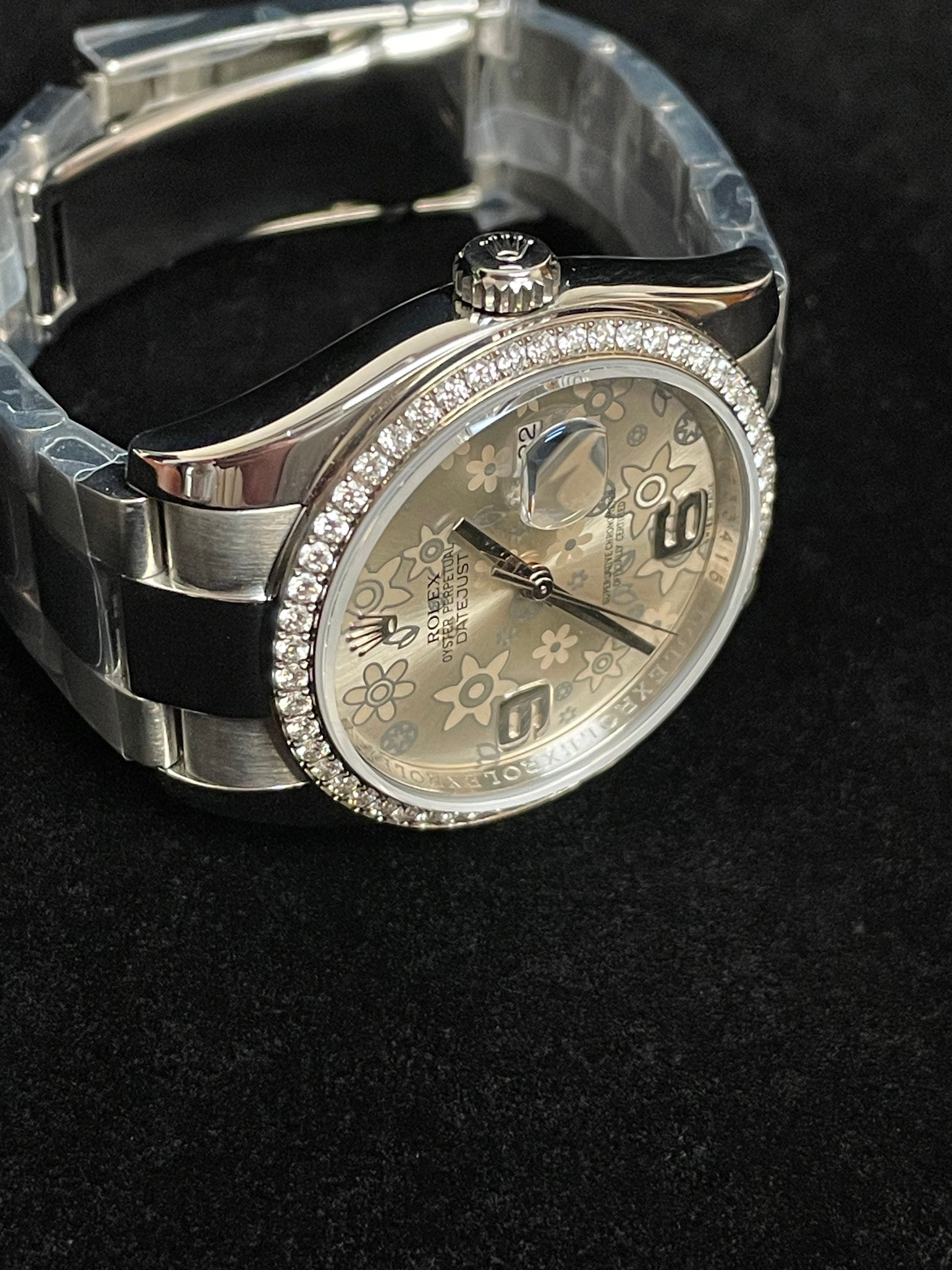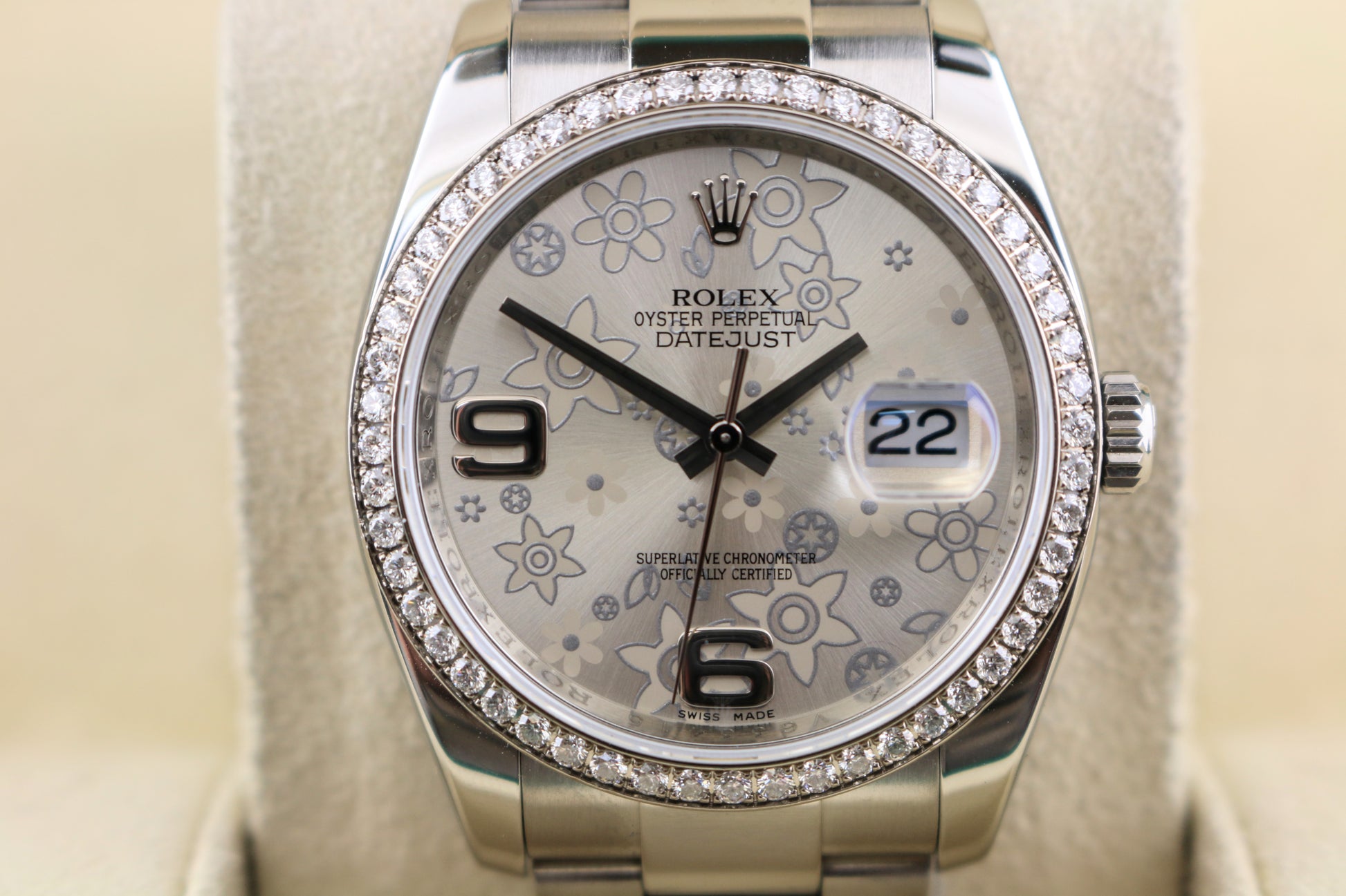 OHA 2010 Rolex Datejust 116244 Silver Floral Diamond Bezel SS Oyster W/ Papers 36mm