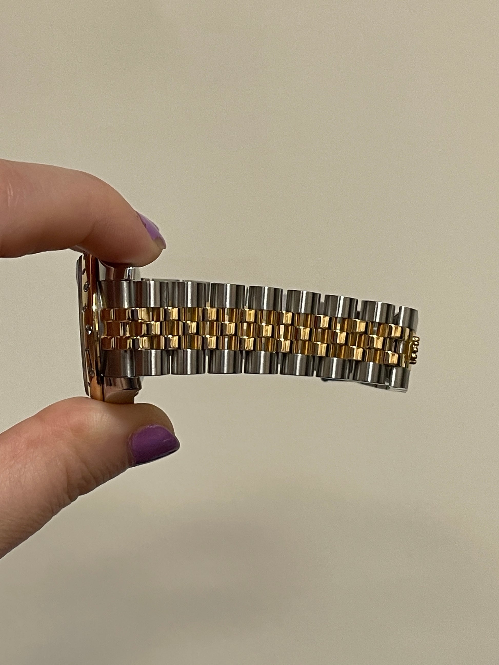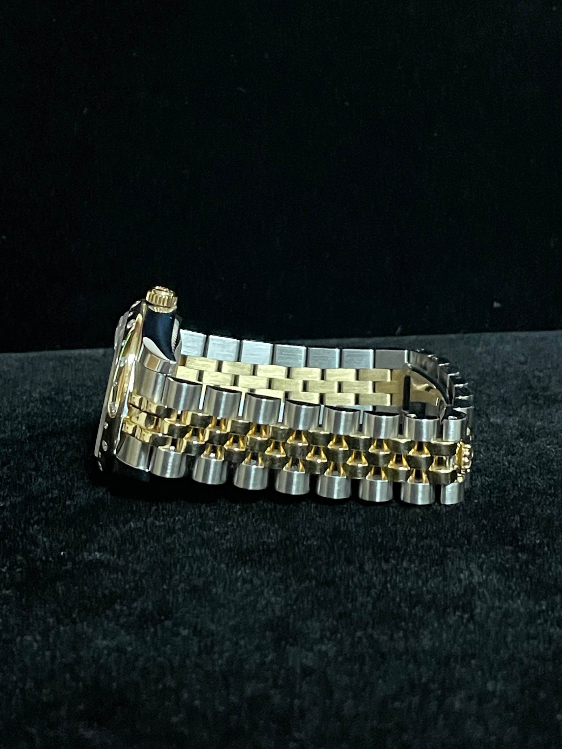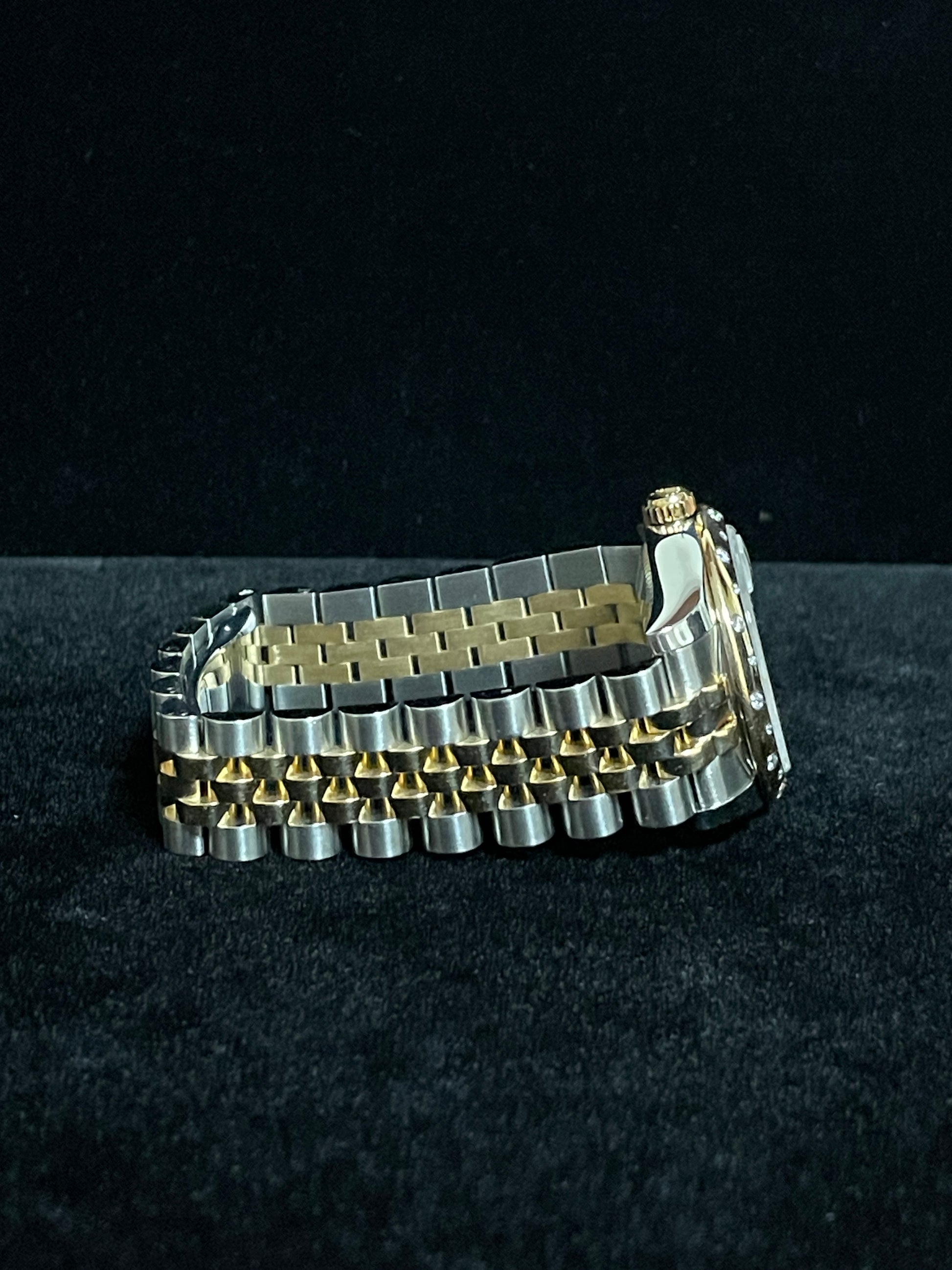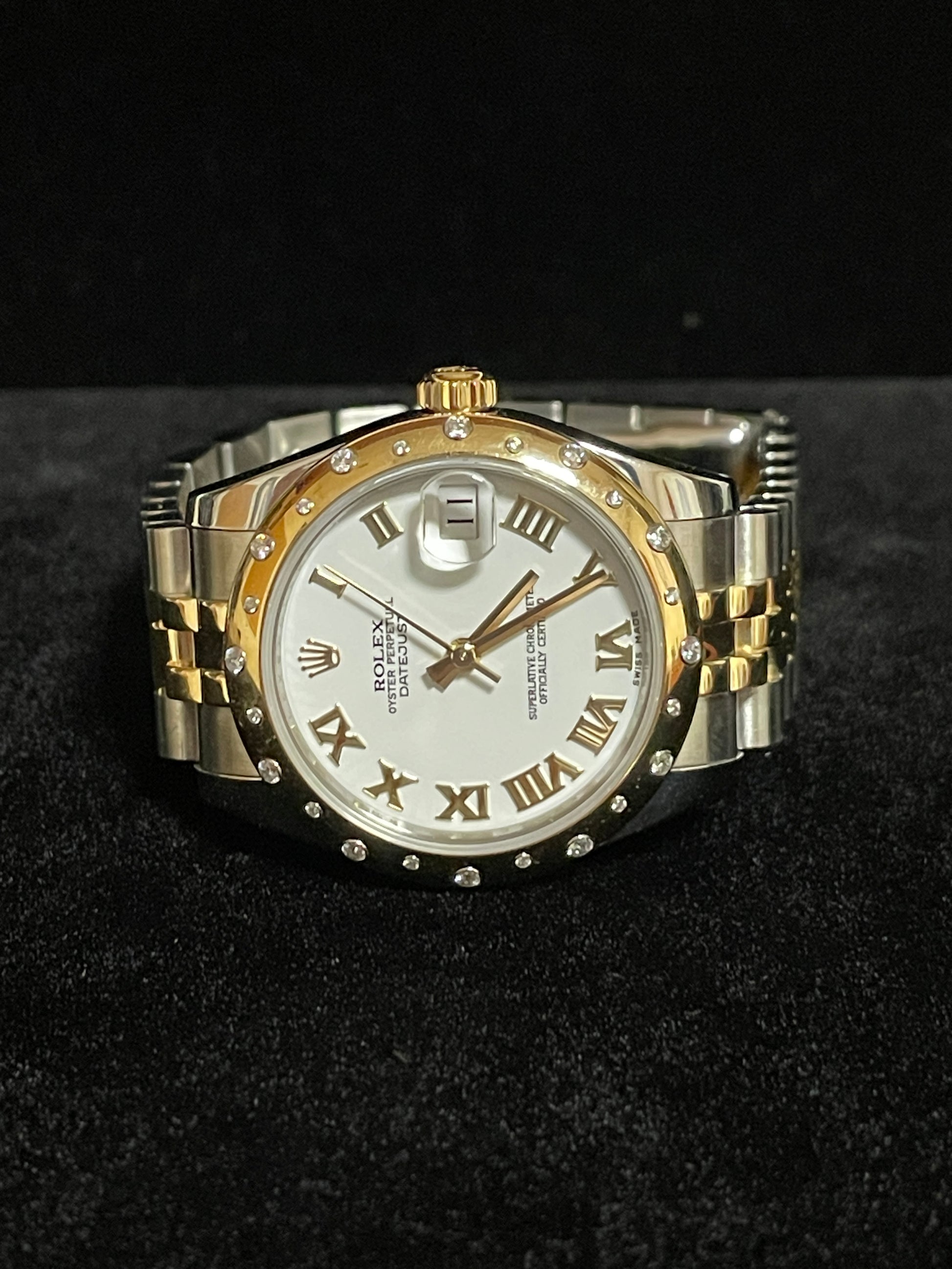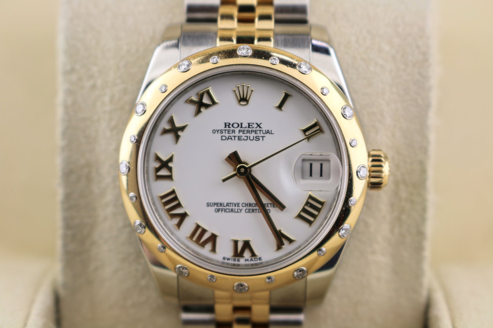 Condition: 9/10- Watch is beautiful and in excellent condition! Stunning scattered diamond bezel, white roman dial, this is the midsize model and will fit perfectly on a ladies wrist.