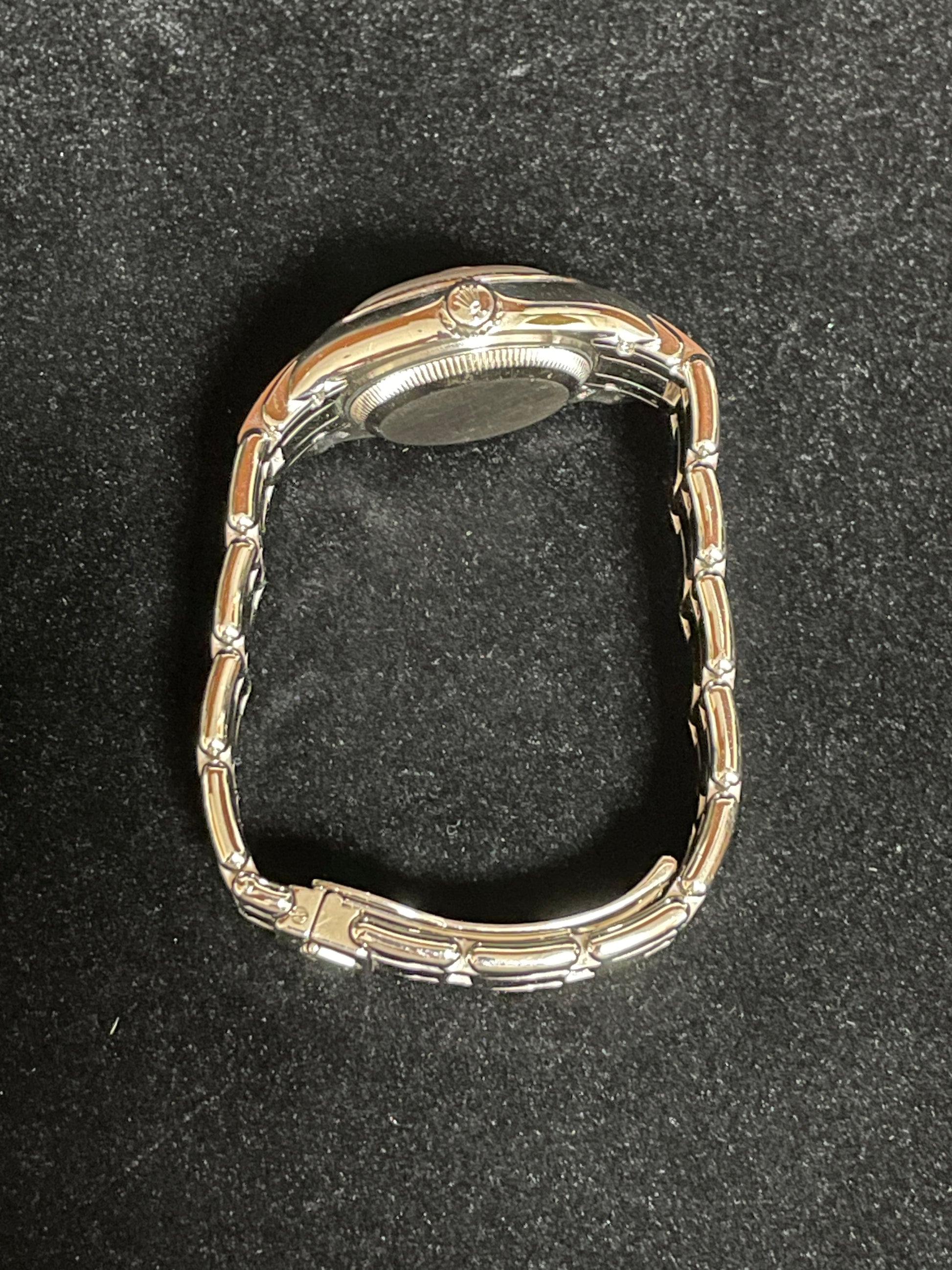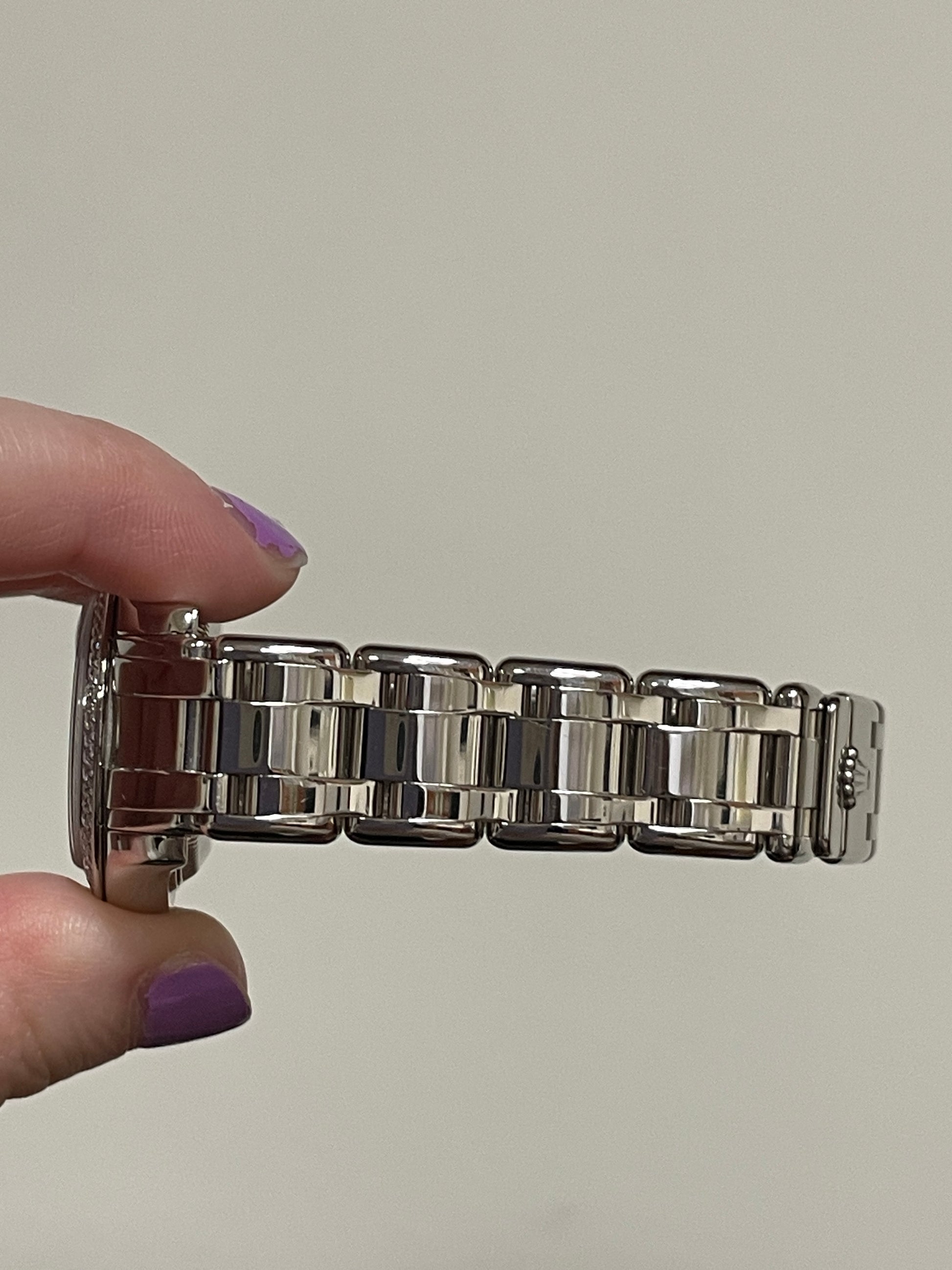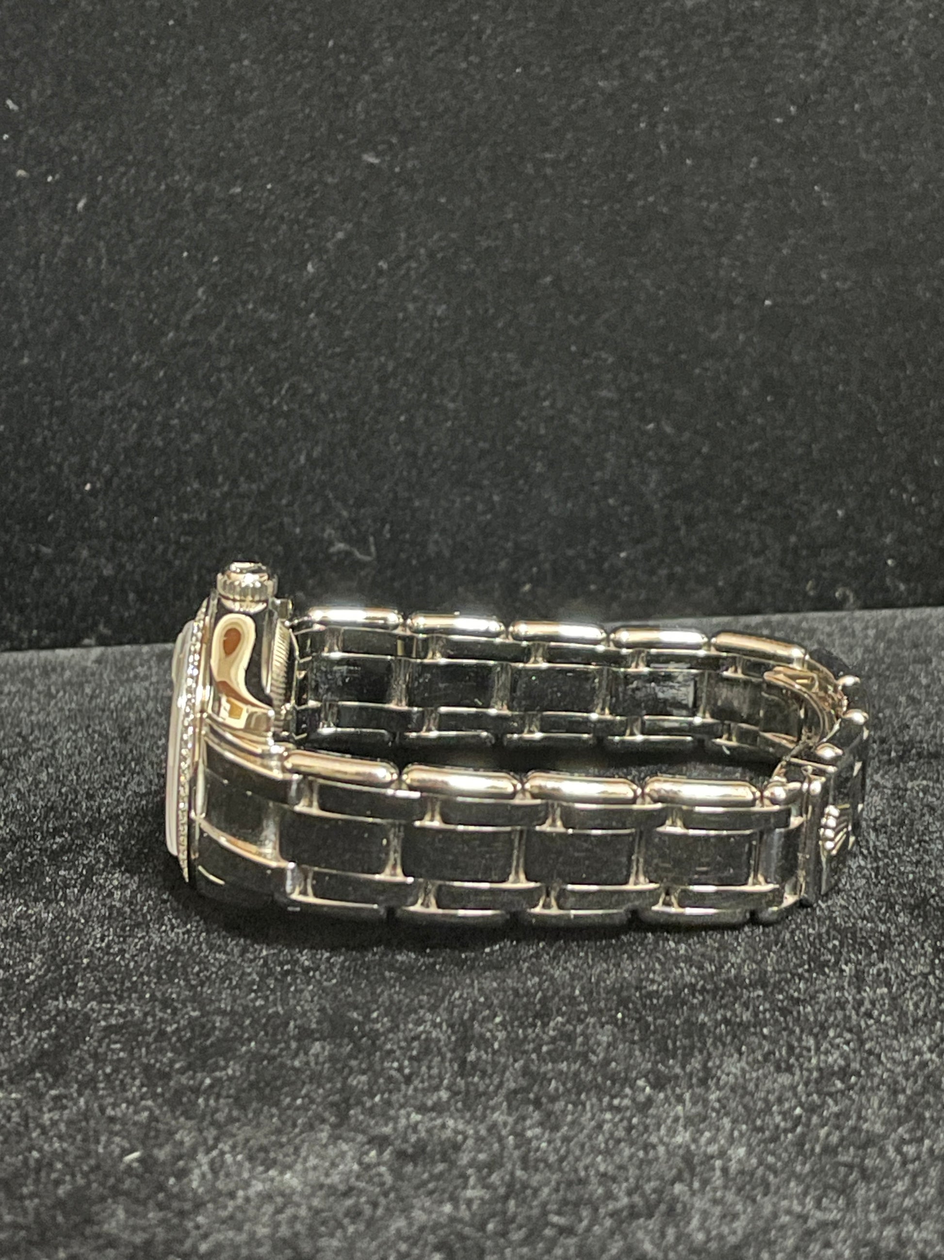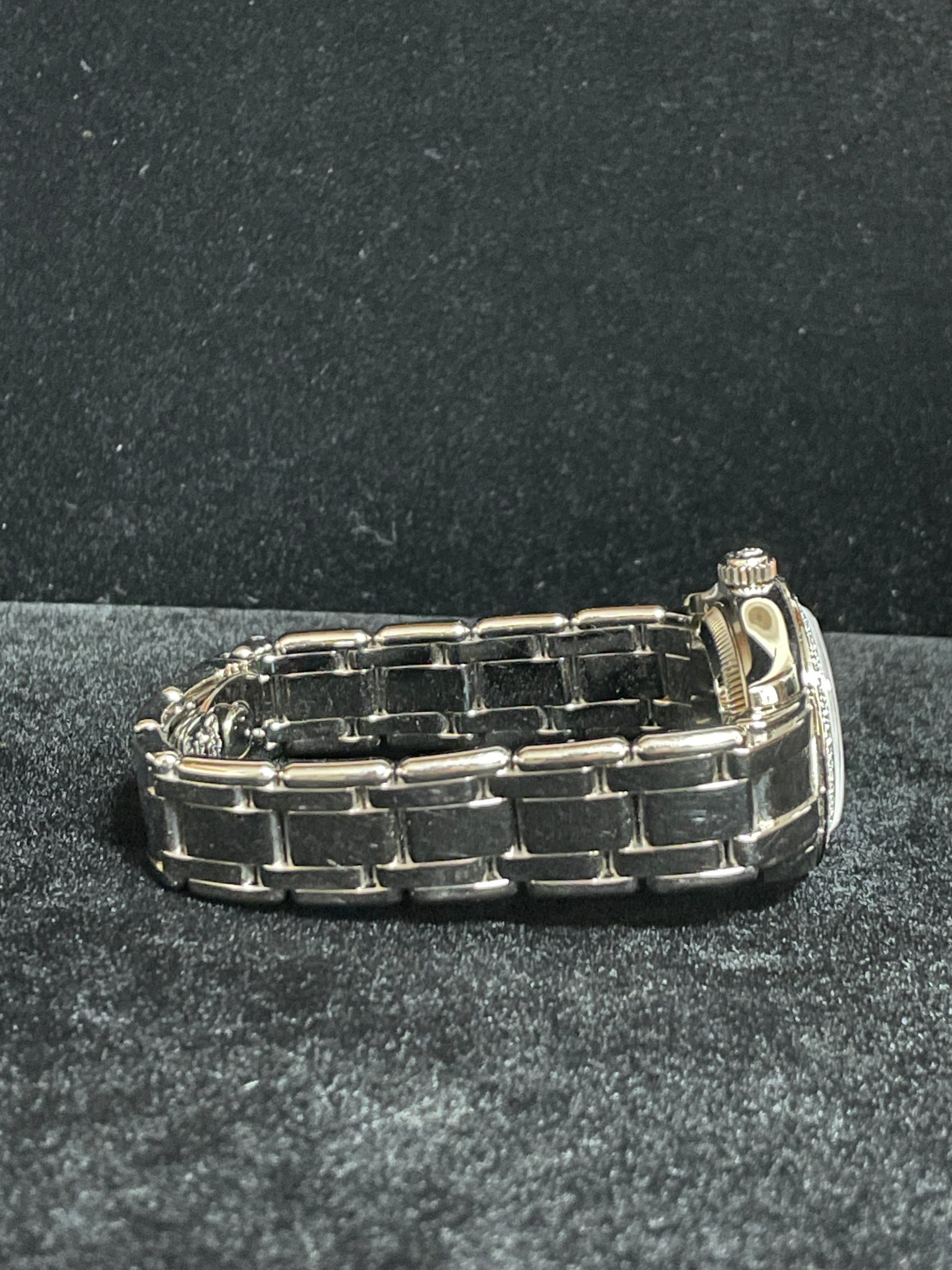 Condition: 9/10- Bracelet & buckle have light surface scratching. Truly remarkable timepiece factory two row diamond bezel with Mother of pearl roman dial. Solid 18kt white gold 98.5 grams