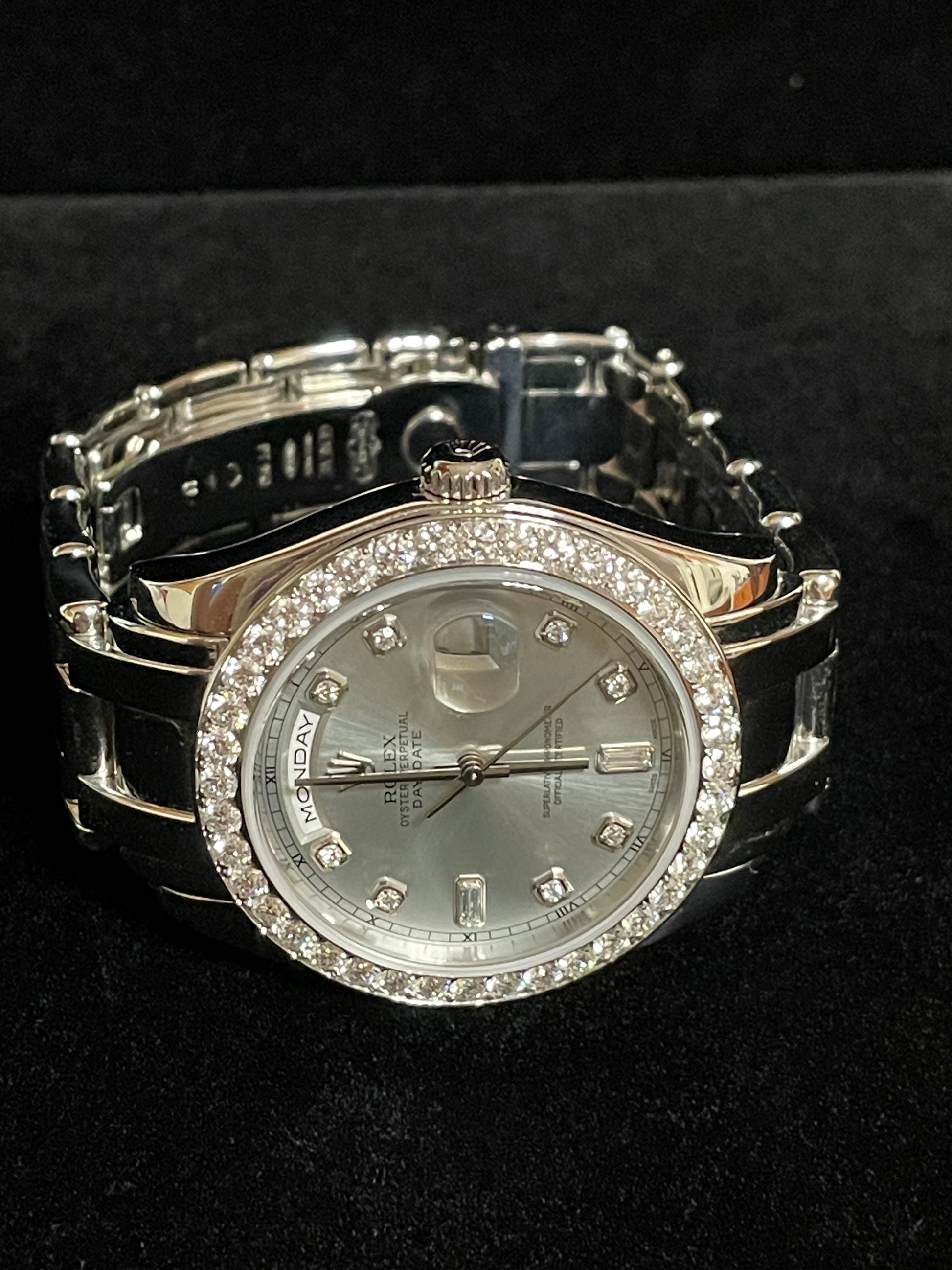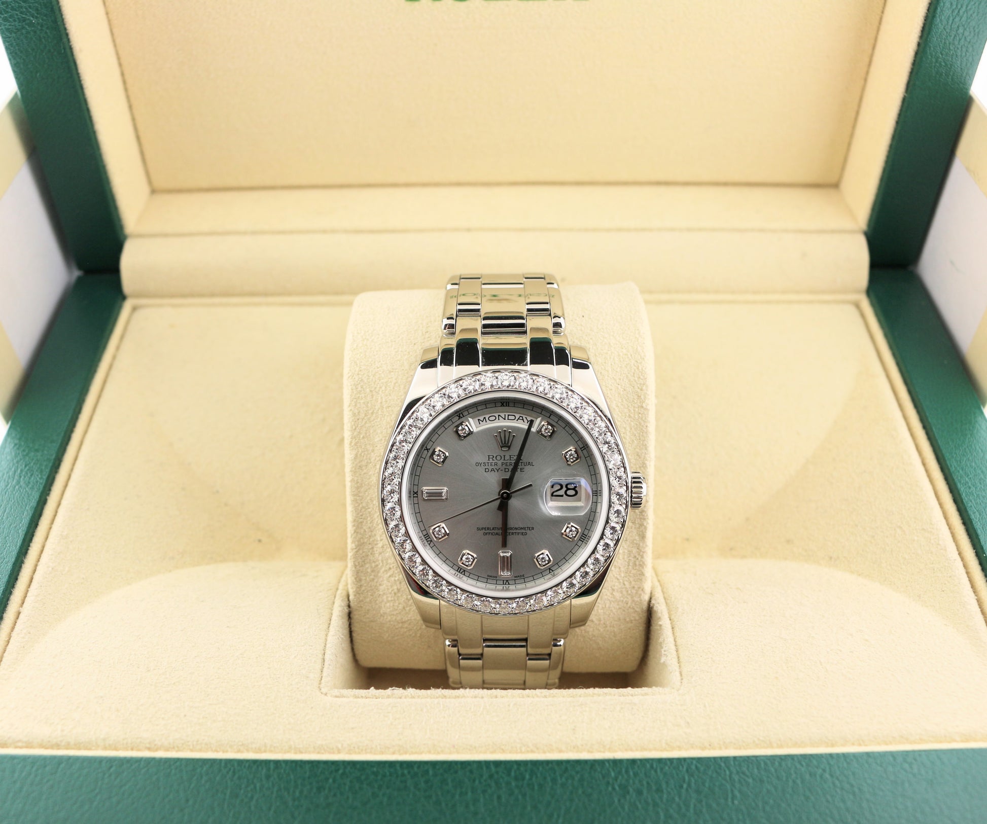 Condition: 9/10- Watch is very nice overall! Beautiful! Stunning factory diamond dial and bezel pearl master solid platinum, weighing 251 grams