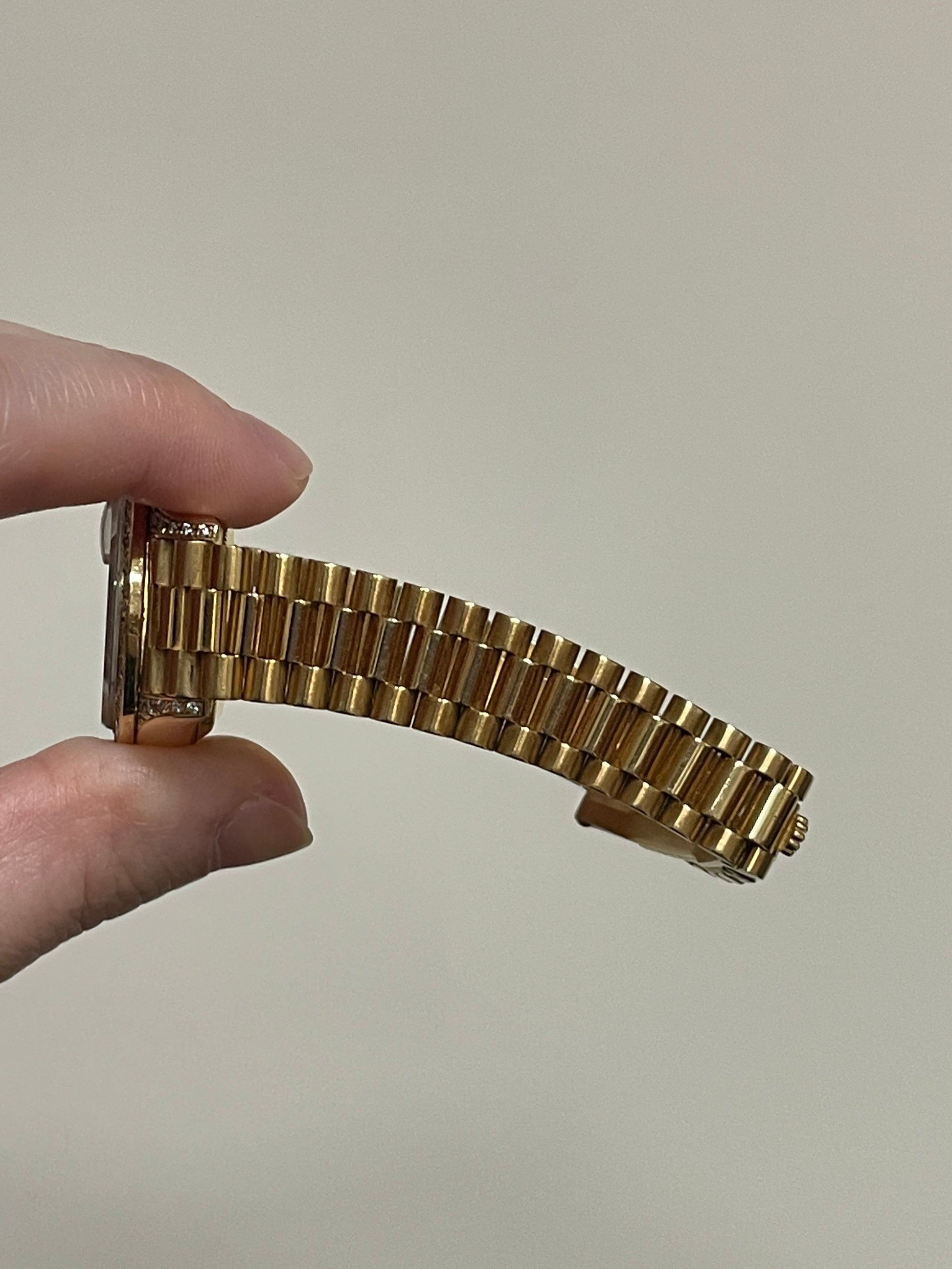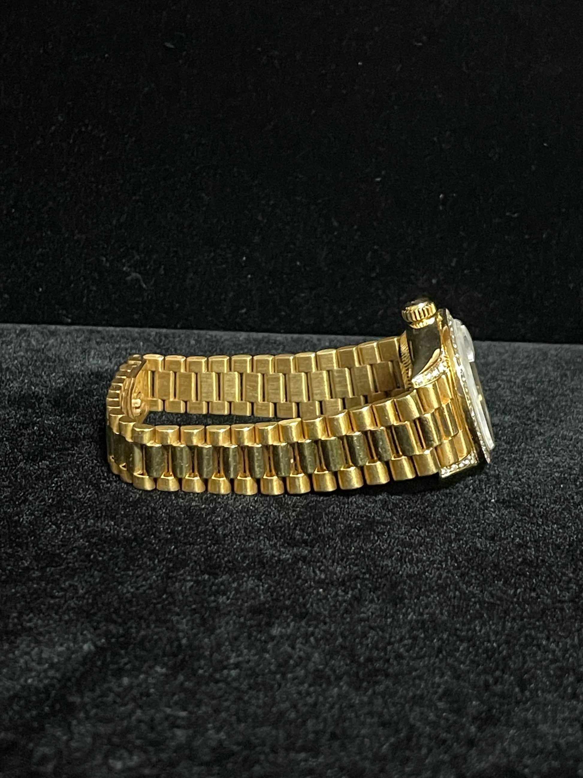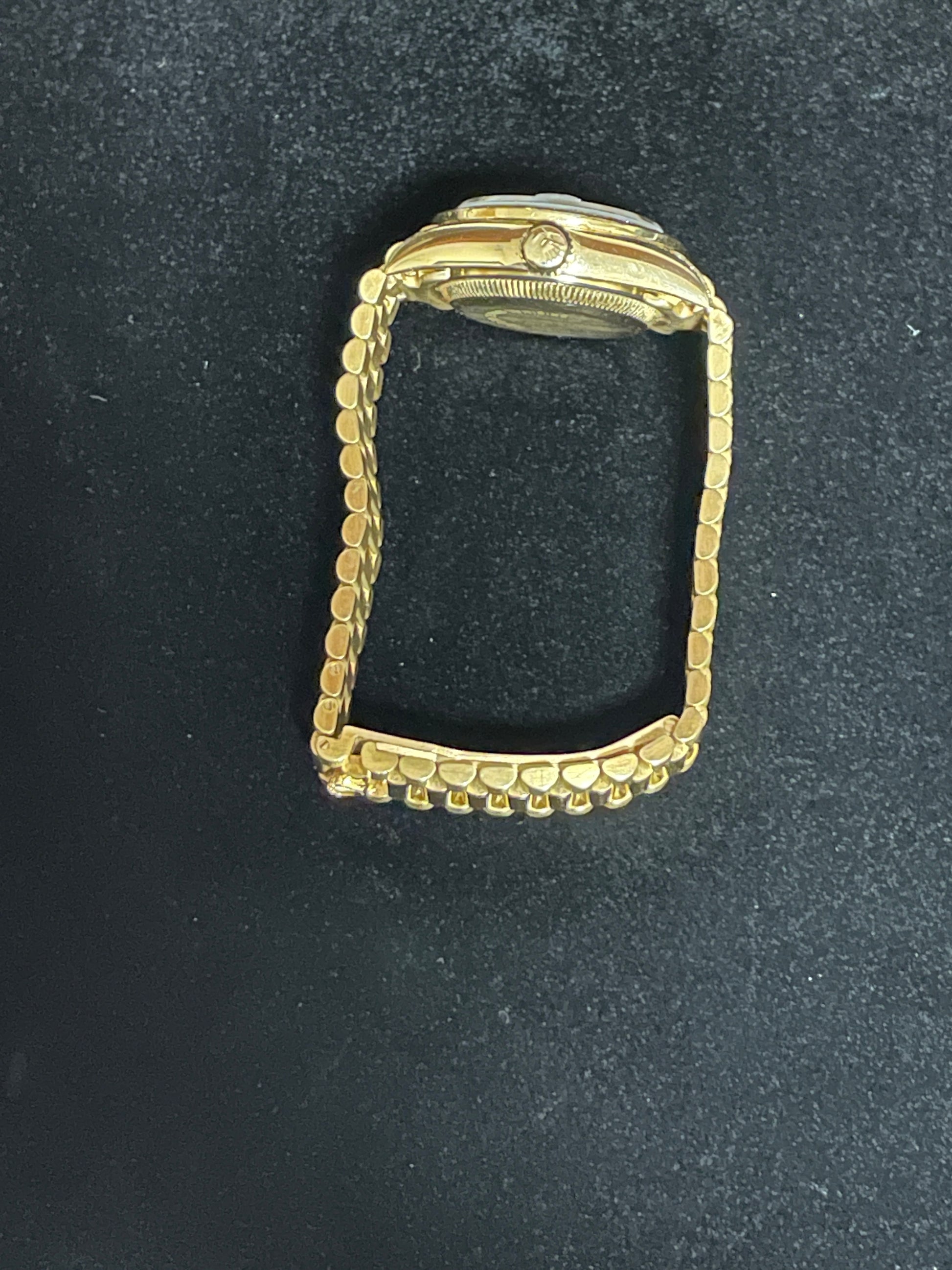 Condition: 9/10- Very light and barely noticeable signs of use on bracelet. Overall very nice! This is part of the rare exclusive crown collection gem pieces, with the factory diamond bezel, lugs and dial. Very difficult to find such exclusive timepieces, total weight 72.5 grams 18kt gold. Given its age, the bracelet shows minimal stretch and has developed gorgeous patina across the case and bracelet.